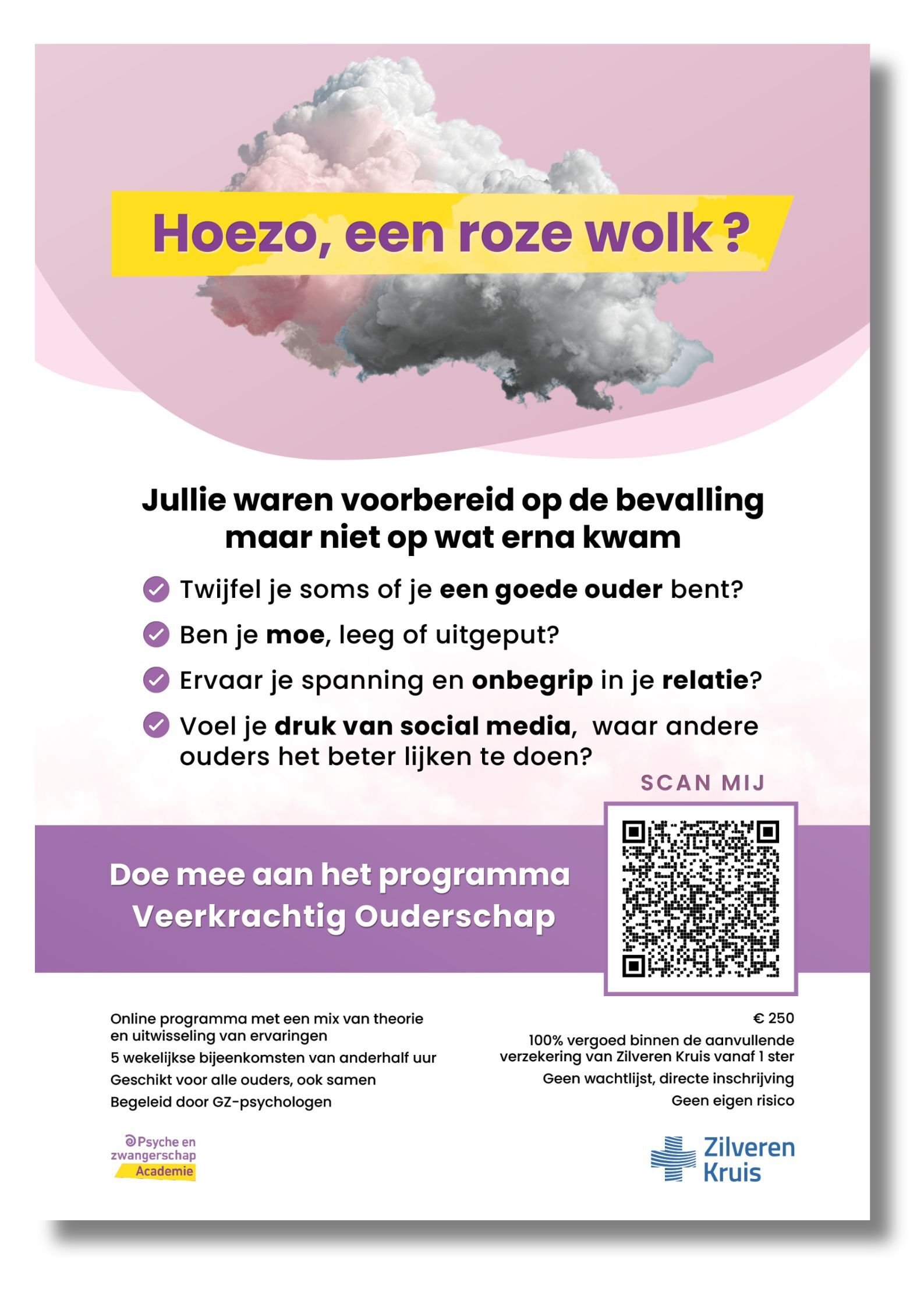 De cursus Veerkrachtig Ouderschap is een preventieprogramma en geen psychologische behandeling. De cursus is bedoeld voor (aanstaande) ouder(s) die zich onzeker voelen in het ouderschap, angstig zijn, soms wat somber en/of worstelen met hun nieuwe rol. Het programma vervangt niet een psychologische behandeling, maar kan soms wel een goede aanvulling zijn bij een behandeling. Het programma wordt gegeven door BIG-geregistreerde psychologen (GZ-, Klinisch Psychologen of psychotherapeuten) die affiniteit hebben met en kennis hebben over deze doelgroep en zijn aangesloten bij Psyche en Zwangerschap B.V. Zij hebben in dit programma geen behandelverantwoordelijkheid over de deelnemers. Door te kiezen voor deze programmabegeleiders waarborgen wij kwaliteit.